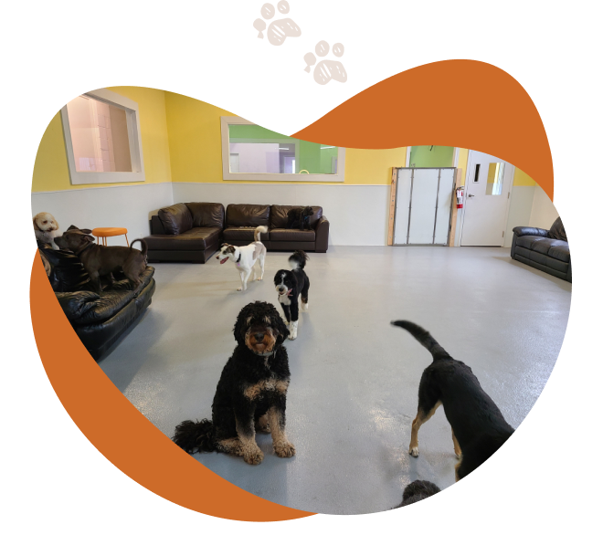 Our specially designed space features plush couches, soft pillows, and a convenient roll-up garage door that provides additional access to our wrap-around backyard. But that’s not all—abundant natural light floods the room, creating a bright and inviting atmosphere where fresh air constantly flows in. Here, your dogs can play, have fun, or simply lounge around in comfort.